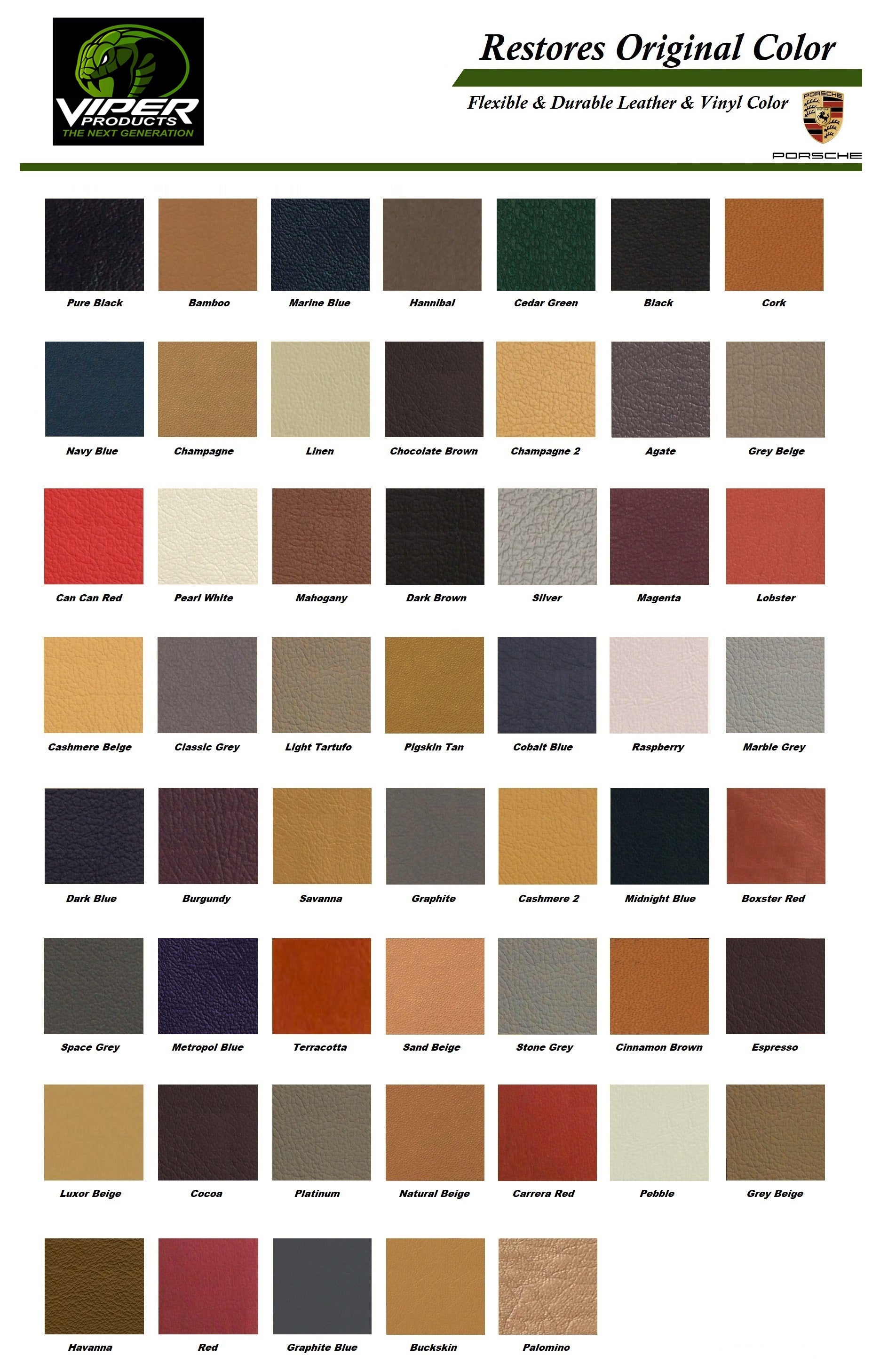 Wir empfehlen daher das Viper Färbeset für Porsche, das alles enthält, was für eine schöne und haltbare Färbung von Leder, Vinyl und Kunstleder benötigt wird. Die Sets eignen sich perfekt für die Ausbesserung und Neufärbung von Porsche-Innenräumen aus Leder, Kunstleder und Vinyl und sind in drei verschiedenen Größen erhältlich.