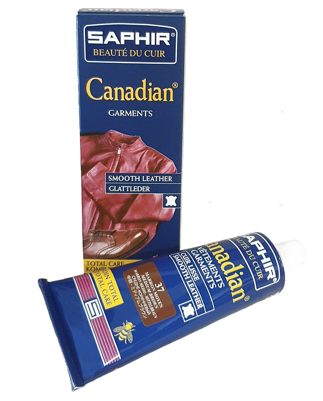 Saphir Canadian är en pigmenterad renoveringskräm som innehåller bivax. Krämen rengör, återfärgar, mjukgör och impregnerar skinnjackor och övriga lädervaror av fint läder.