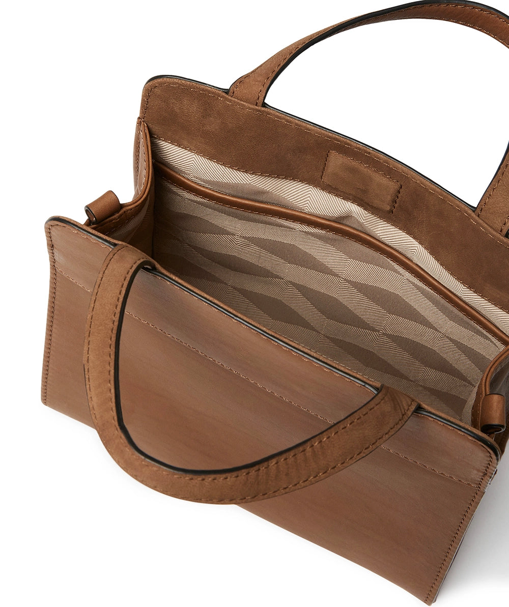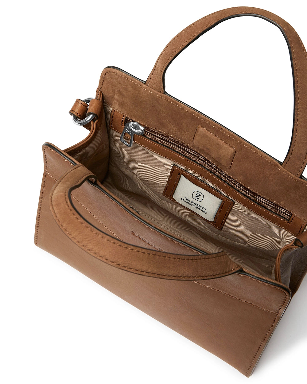 Väskan öppnas till en ljust fodrad insida med smart förvaring – en slip-in-ficka och en dragkedjeficka håller ordning på dina småsaker. Magnetstängningen är dold men kraftfull, vilket gör väskan både säker och lätt att använda.