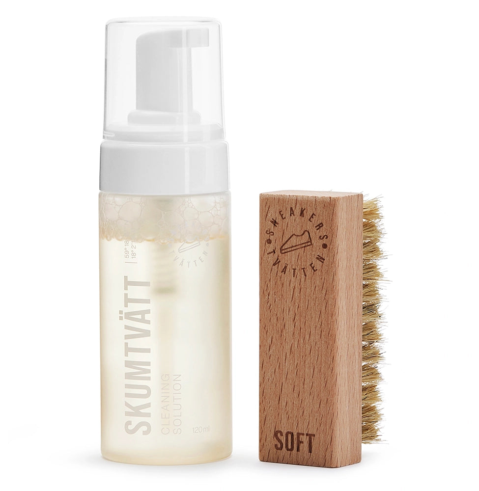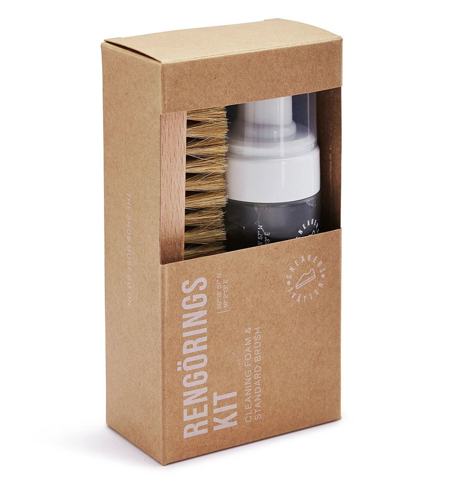 Sneakerstvättens Rengöringskit är ett praktiskt rengöringskit som innehåller Skumtvätt och en mjuk Borste. Rengöringsmedlet är ett vattenbaserat och skonsamt rengöringsskum baserat på sockerrörsextrakt, ett naturligt ämne som verkar effektivt mot fläckar, samt en praktiskt rengöringborste avsedd för skon ovandelar. PFAS-fri.