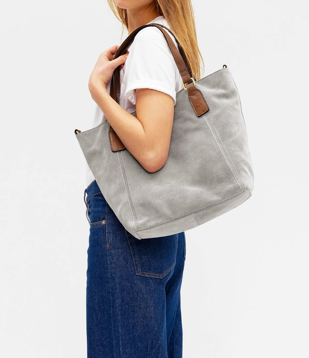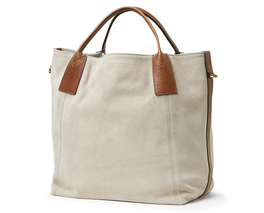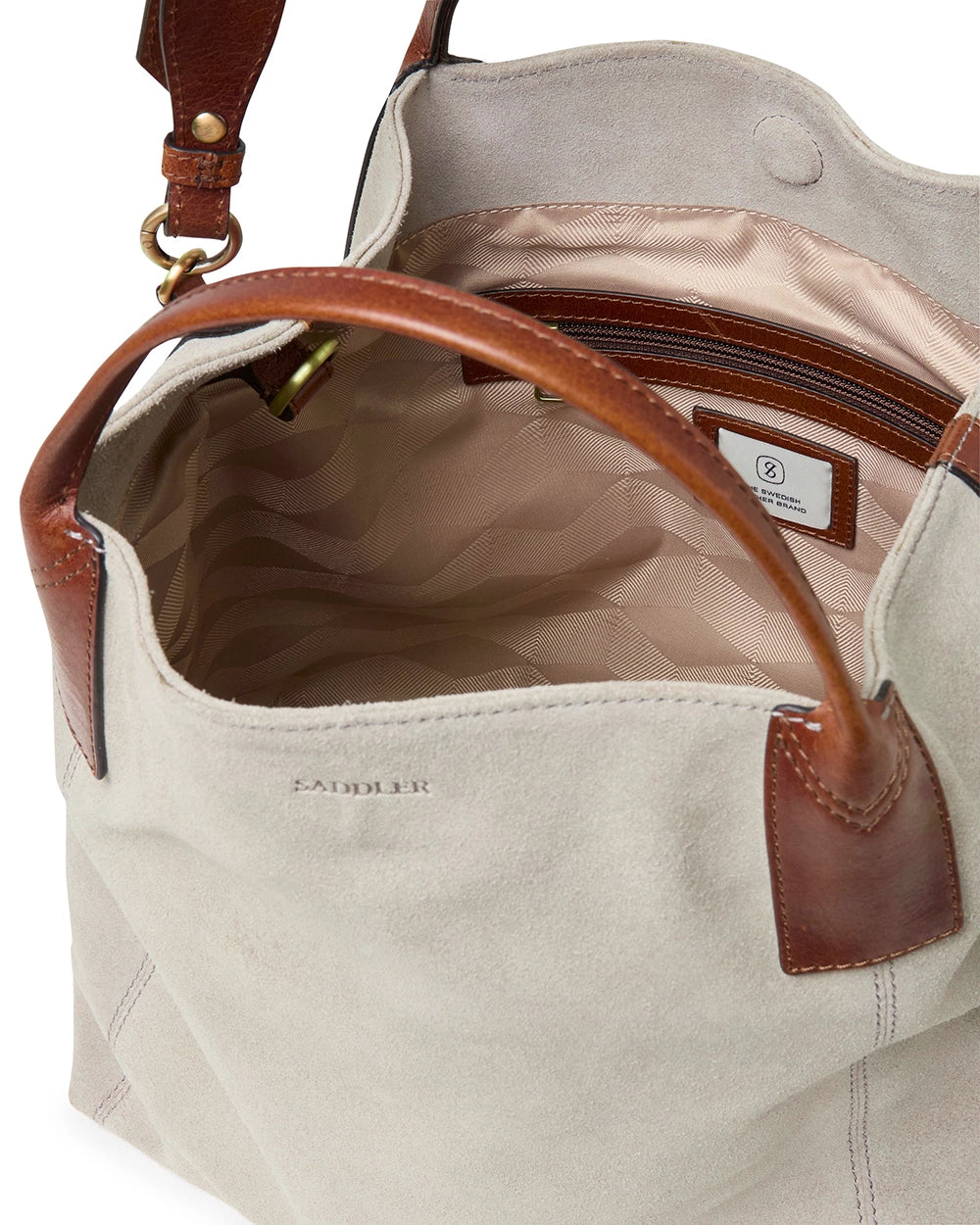 De långa handtagen i läder ger bekväm bärkomfort, medan kontrasten mellan läder och mocka skapar en exklusiv och modern känsla. Väskan levereras med en justerbar och avtagbar axelrem i läder (längd 99–120 cm), så du enkelt kan bära den både som handväska, axelväska eller crossbody.